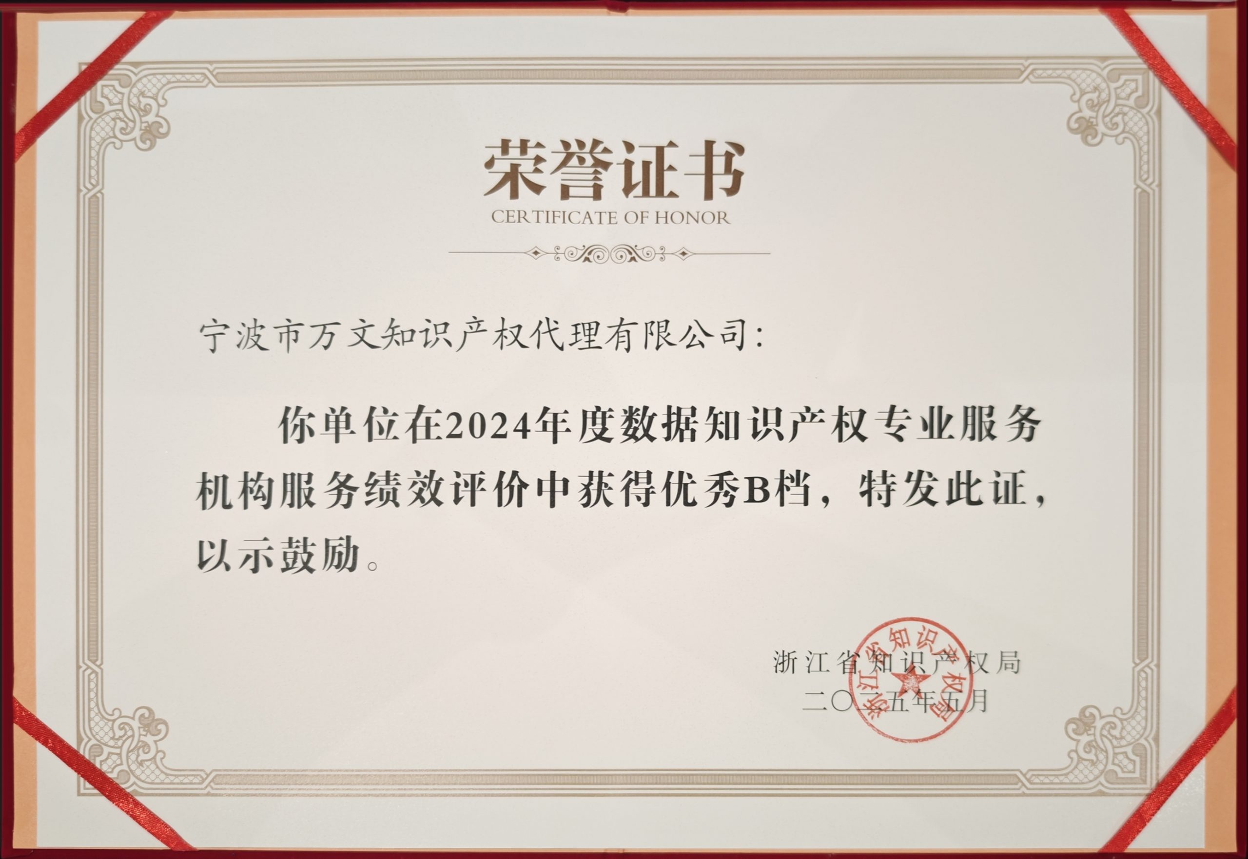 4月,浙江省市场监督管理局公布2024年度浙江省数据知识产权专业服务机构绩效评估结果。万文知识产权凭借突出的数据知识产权服务能力、创新的技术解决方案与优质的客户服务,连续两年获评“浙江省数据知识产权优秀服务机构”,并成为宁波地区唯一获此殊荣的专业机构。